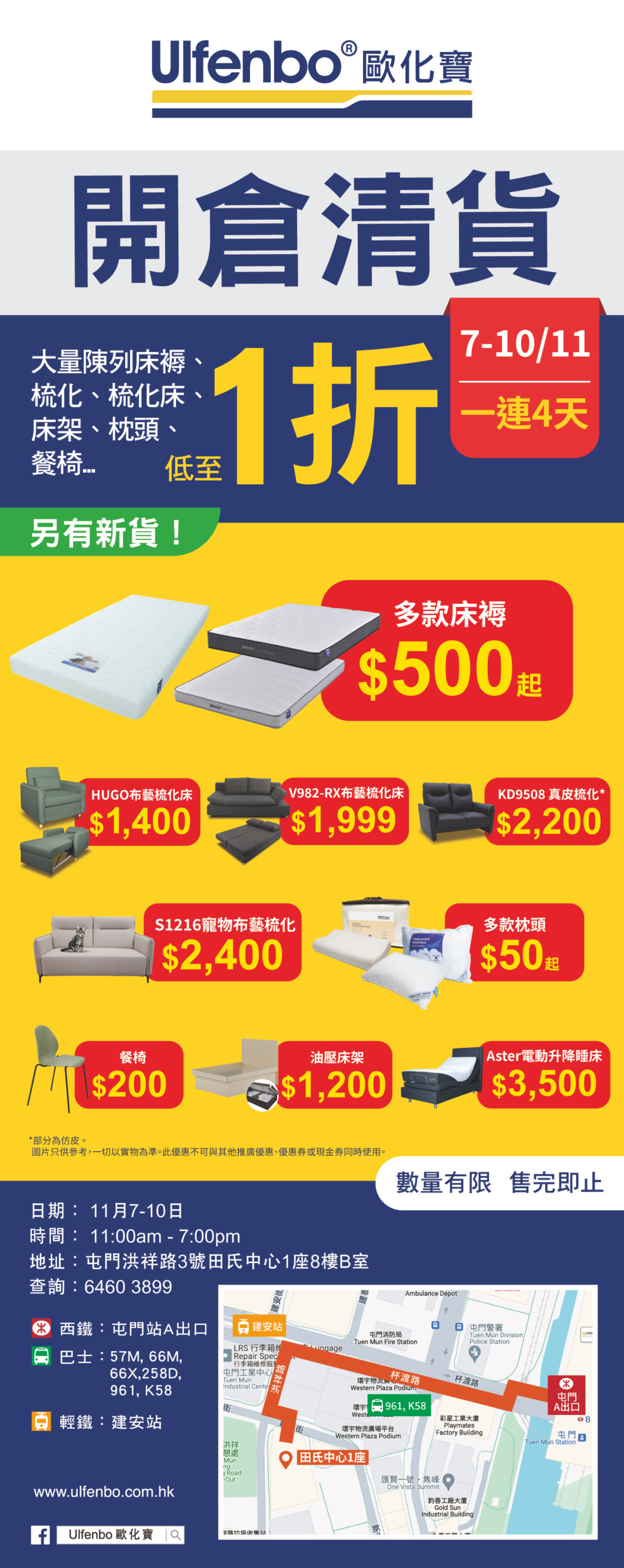 大量陳列梳化、梳化床、床褥、床架、枕頭、餐椅等低至1折發售!